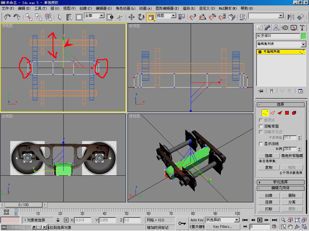 单击前视图,点移动键,用鼠标框选前视图中全部顶点,把鼠标移到Y轴上,按住鼠标向上移动,让这个“长方体01”(摇枕)刚好搭在转向架中间的洞