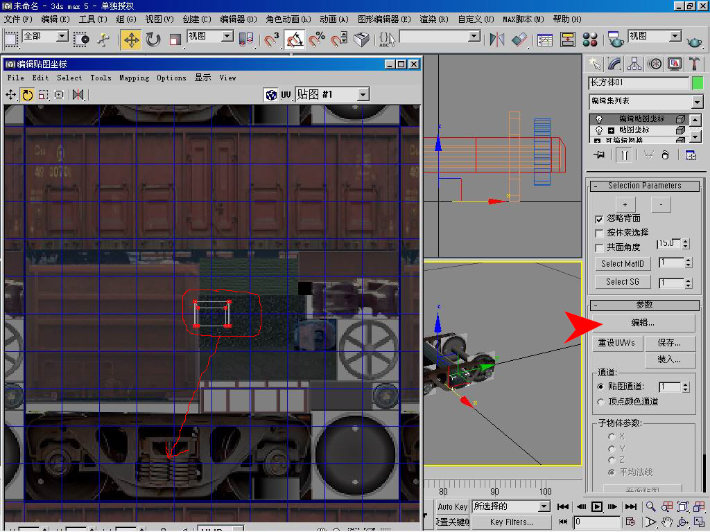 单击 缩放键把贴图编辑窗口中的模型放大,通过 移动键和 缩放键,把转向架挪到转向架贴图上,大小刚好和贴图中的转向架图形对正。 |